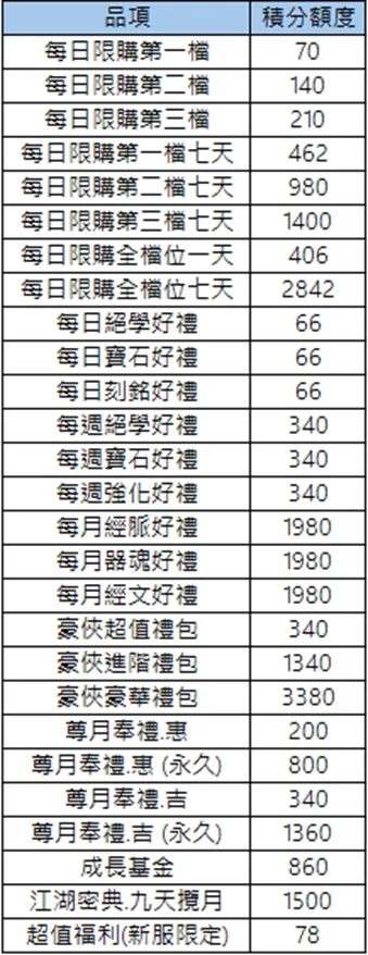 不再上述列表之禮包,將依照其台幣定價,以1台幣=2積分的形式進行轉換。實際積分以遊戲獲得為準。